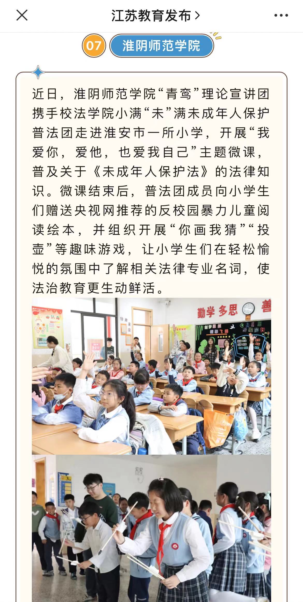 近日,必赢71886网址登录“青鸾”理论宣讲团携手校法学院小满“未”满未成年人保护普法团走进淮安市一所小学,开展“我爱你,爱他,也爱我自己”主题微课,普及关于《未成年人保护法》的法律知识。微课结束后,普法团成员向小学生们赠送央视网推荐的反校园暴力儿童阅读绘本,并组织开展“你画我猜”“投壶”等趣味游戏,让小学生们在轻松愉悦的氛围中了解相关法律专业名词,使法治教育更生动鲜活。