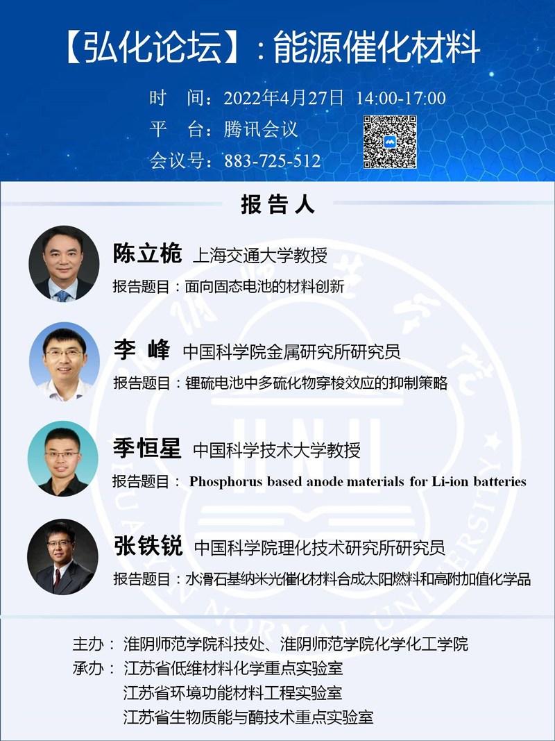 报告人:陈立桅,上海交通大学,物理化学教授,博士生导师。中科大学士,北京大学硕士, 哈佛大学博士。2008年12月受聘回国,曾任中国科学院苏州纳米所副所长,研究员。入选中组部万人计划“中青年科技创新领军人才”,获基金委杰出青年科学基金资助,2018起任上海交通大学化学化工学院教授。研究兴趣集中在能源材料的创新与能源器件表界面原位表征。在锂电储能方面,发展了正极安全添加材料、锂碳复合负极材料、本体界面快离子导体等多种材料,并与相关企业密切合作。