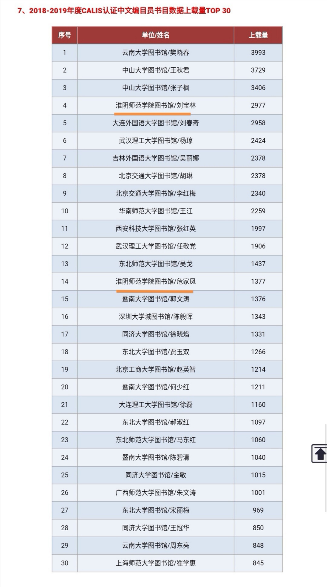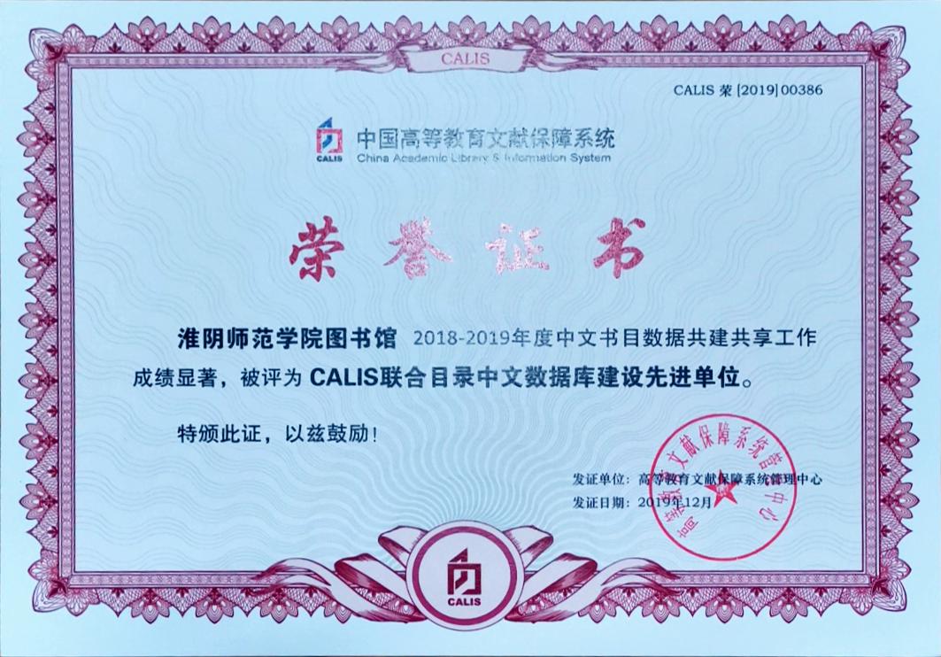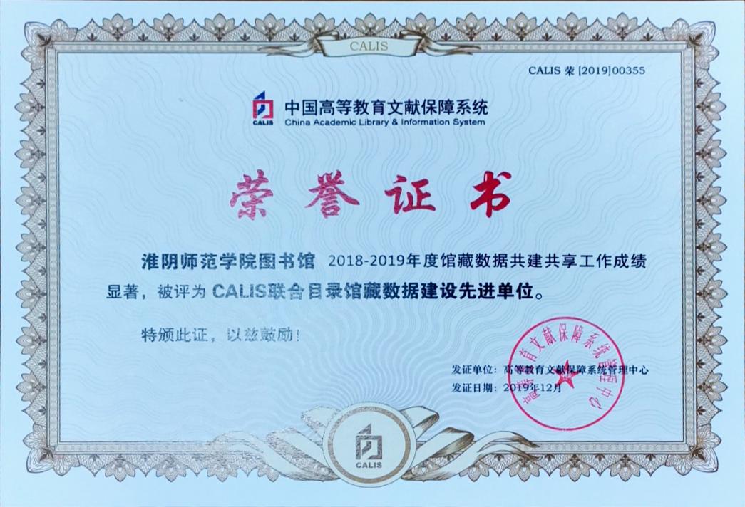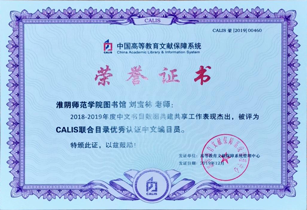 淮师新闻网12月6日电(记者 邹鑫)近日,从中国高等教育文献保障系统(CALIS)联机编目工作中心再传喜讯,必赢71886网址登录图书馆文献资源建设部在2018-2019年度书目数据共建共享工作中表现突出,荣获CALIS联合目录建设多项荣誉。在全国1200多所高校图书馆中,图书馆中文书目原编数据上载量排名第10位,上载数据4374条,较去年进步4位,荣获“2018—2019年度CALIS联合目录中文数据库建设先进单位奖”;馆藏上载量排名第29位,上载数据28719条,荣获“2018—2019年度CALIS联合目录馆藏数据建设先进单位奖”;在“CALIS中文认证编目员书目数据上载量TOP30”榜单中,我馆文献资源建设部刘宝林老师位居第4位,危家凤老师位居第14位,分别荣获“2018—2019年度CALIS联合目录优秀认证中文编目员奖”。