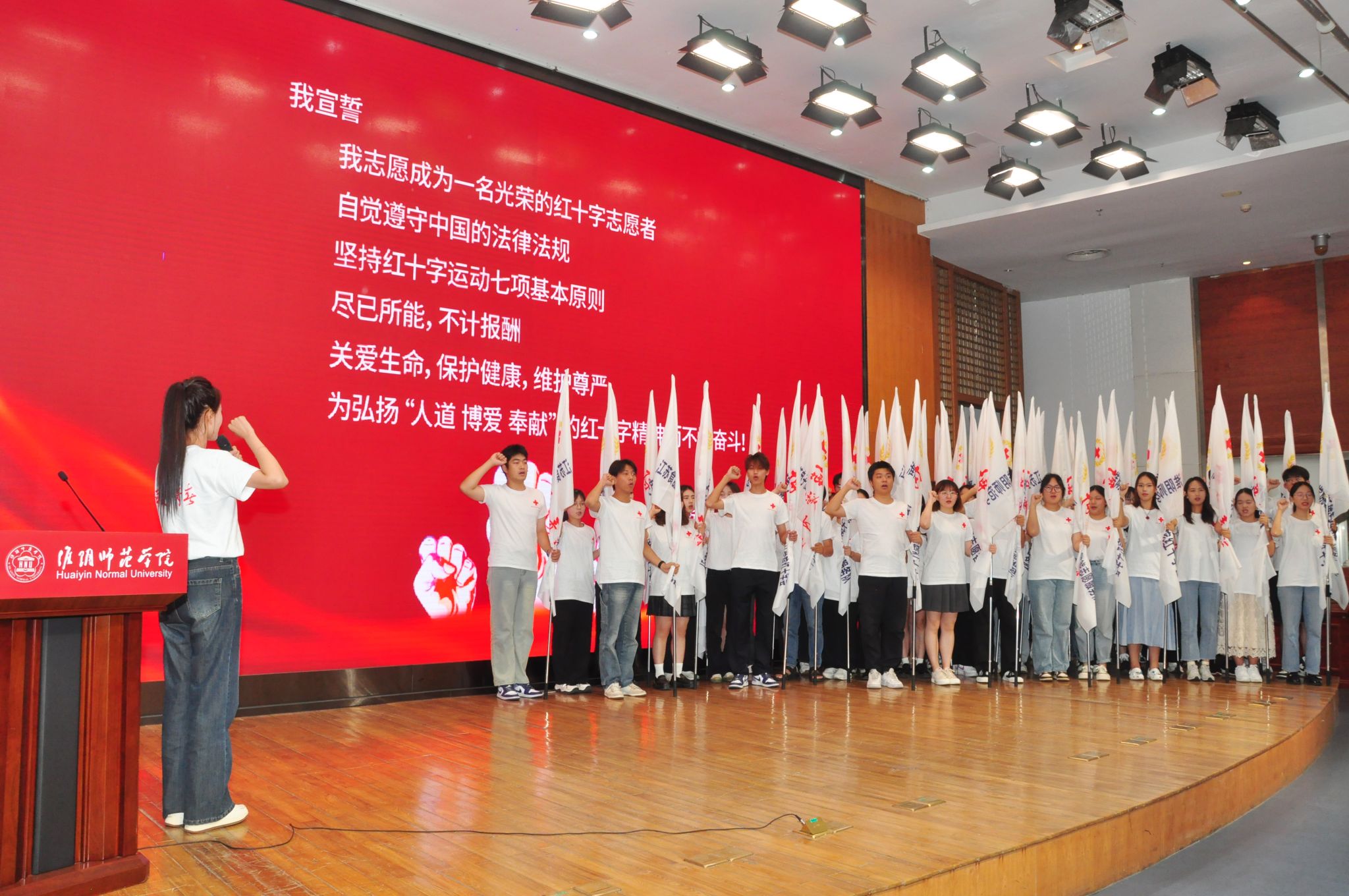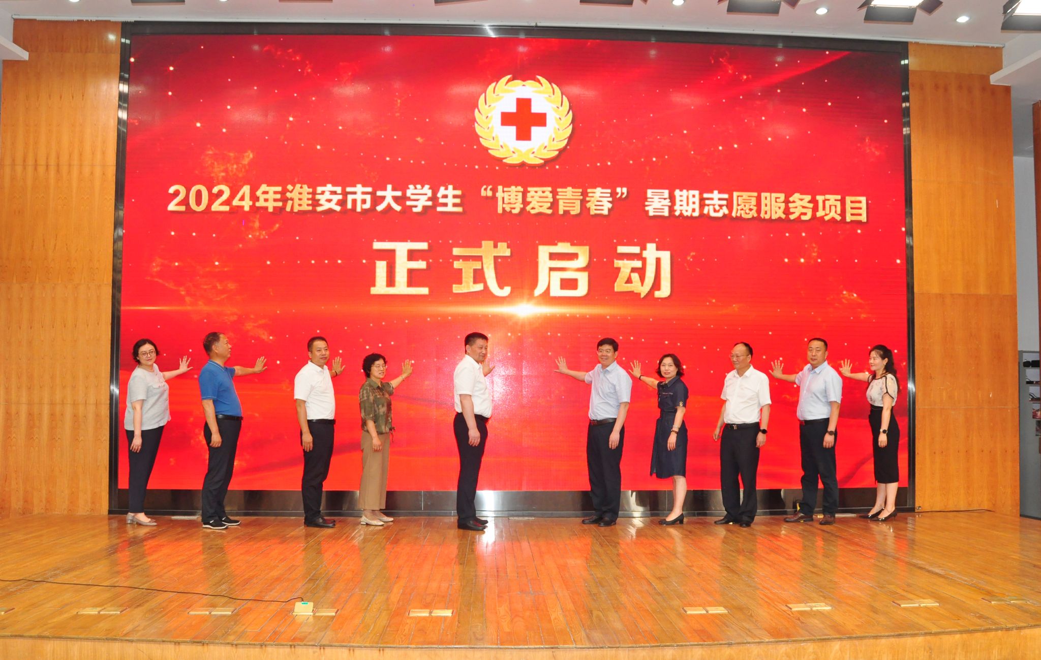 与会领导为所有参与实施的项目团队授旗并共同启动2024年淮安市大学生红十字志愿者“博爱青春”“博爱星火”暑期志愿服务项目。大学生红十字志愿者举行了集体宣誓仪式。