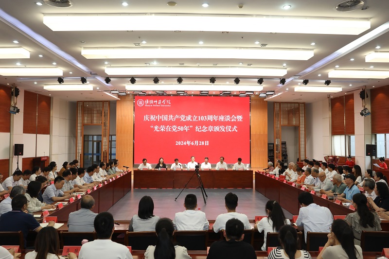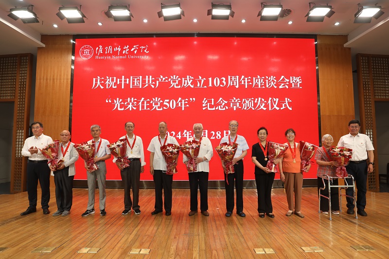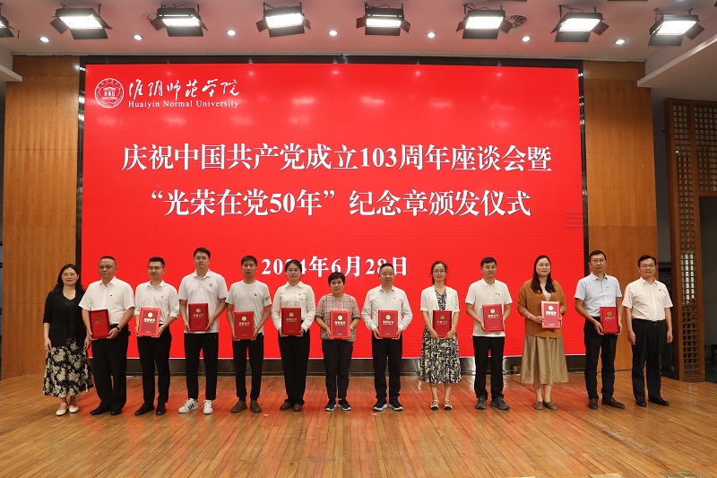 图为淮师举行庆祝中国共产党成立103周年座谈会暨“光荣在党50年”纪念章颁发仪式。记者 唐瑀 摄