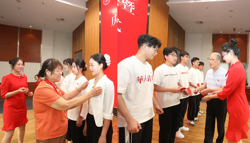 图为老党员代表为新发展党员代表佩戴党员徽章,并赠送《中国共产党章程》。记者 唐瑀 摄