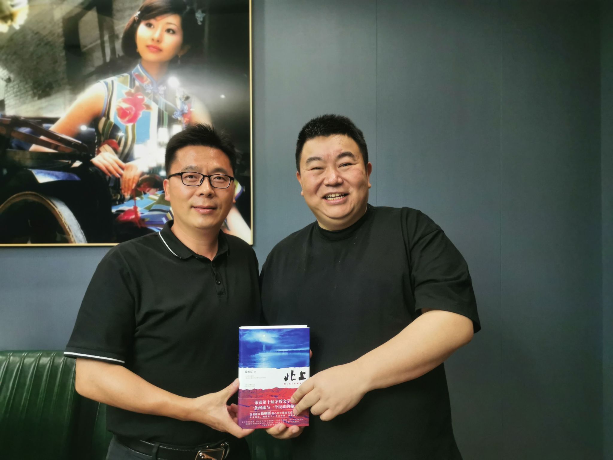 图为孙辉向上海卢新元校友赠送徐则臣校友签名的获奖作品。记者 张善荣