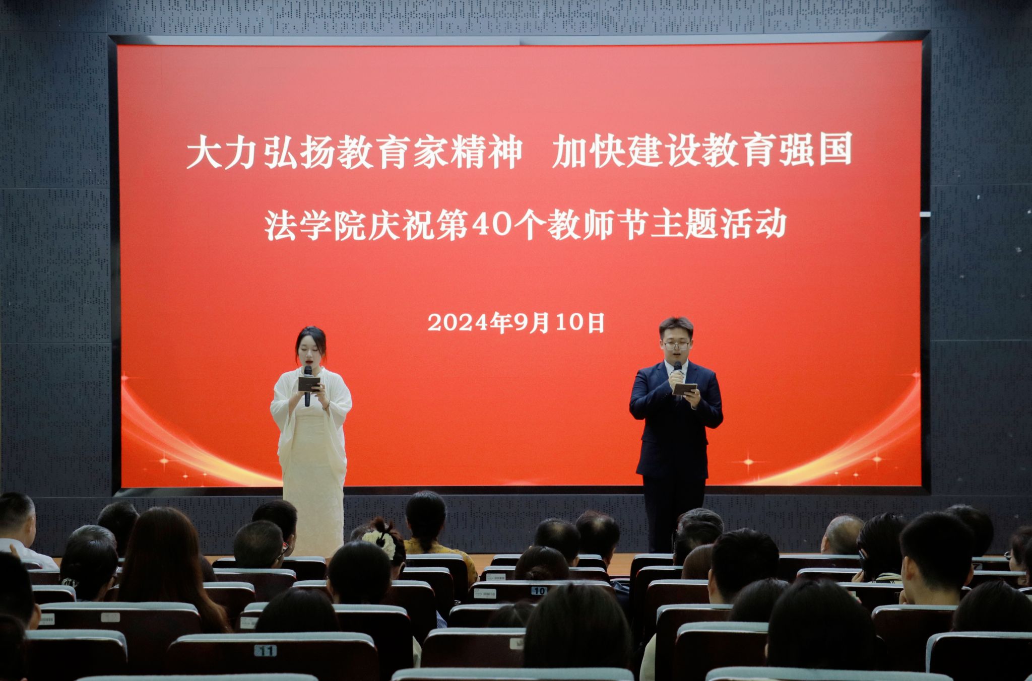 淮师新闻网9月11日电(记者 武美贤 卢悠然)9月10日下午,法学院在交通路校区逸夫报告厅举行了“大力弘扬教育家精神,加快建设教育强国”教师节庆祝活动,向辛勤耕耘在教育一线的教师们致以崇高的敬意和节日的问候。法学院全体教职工、部分学生代表参加了庆祝活动。