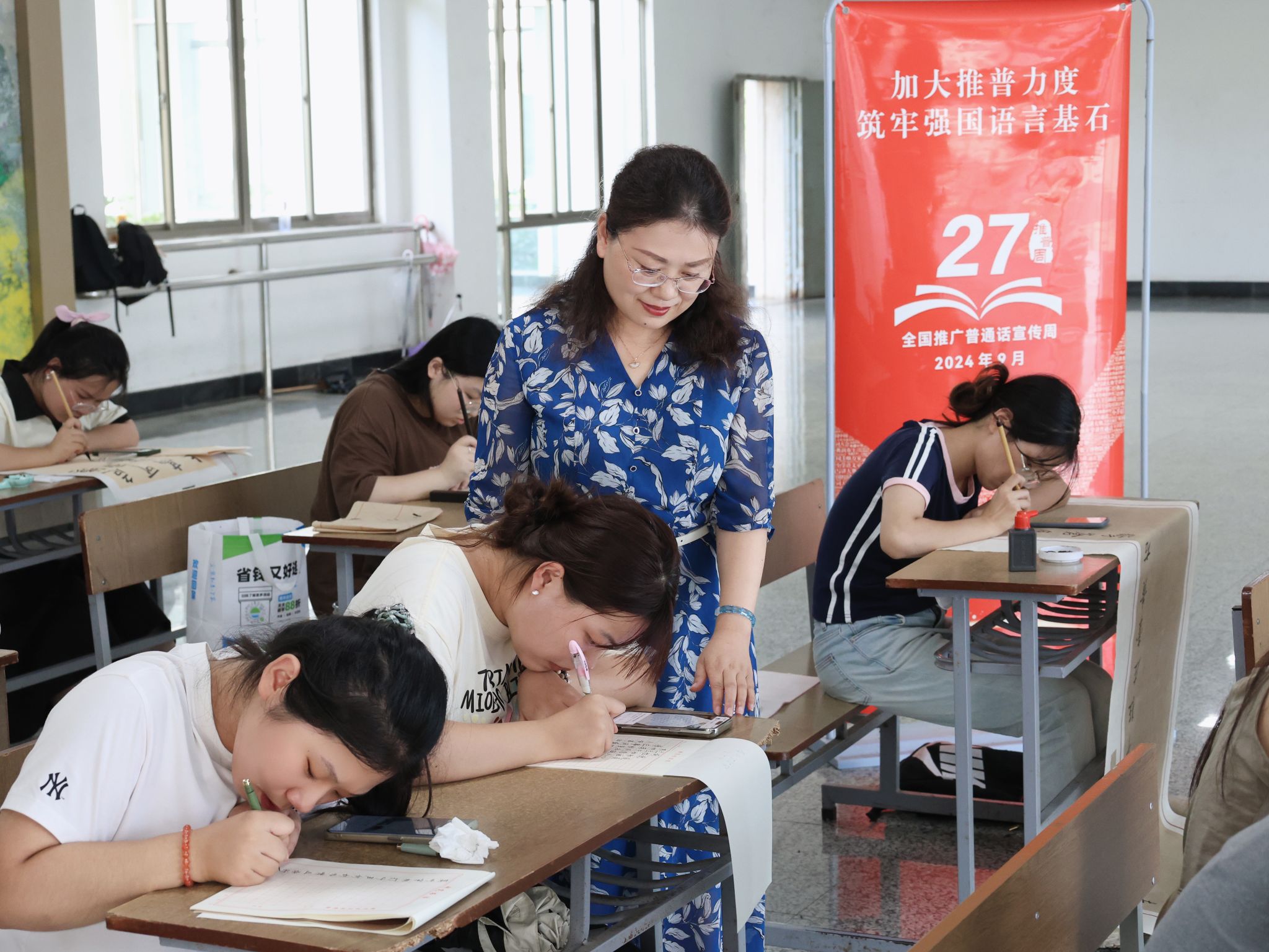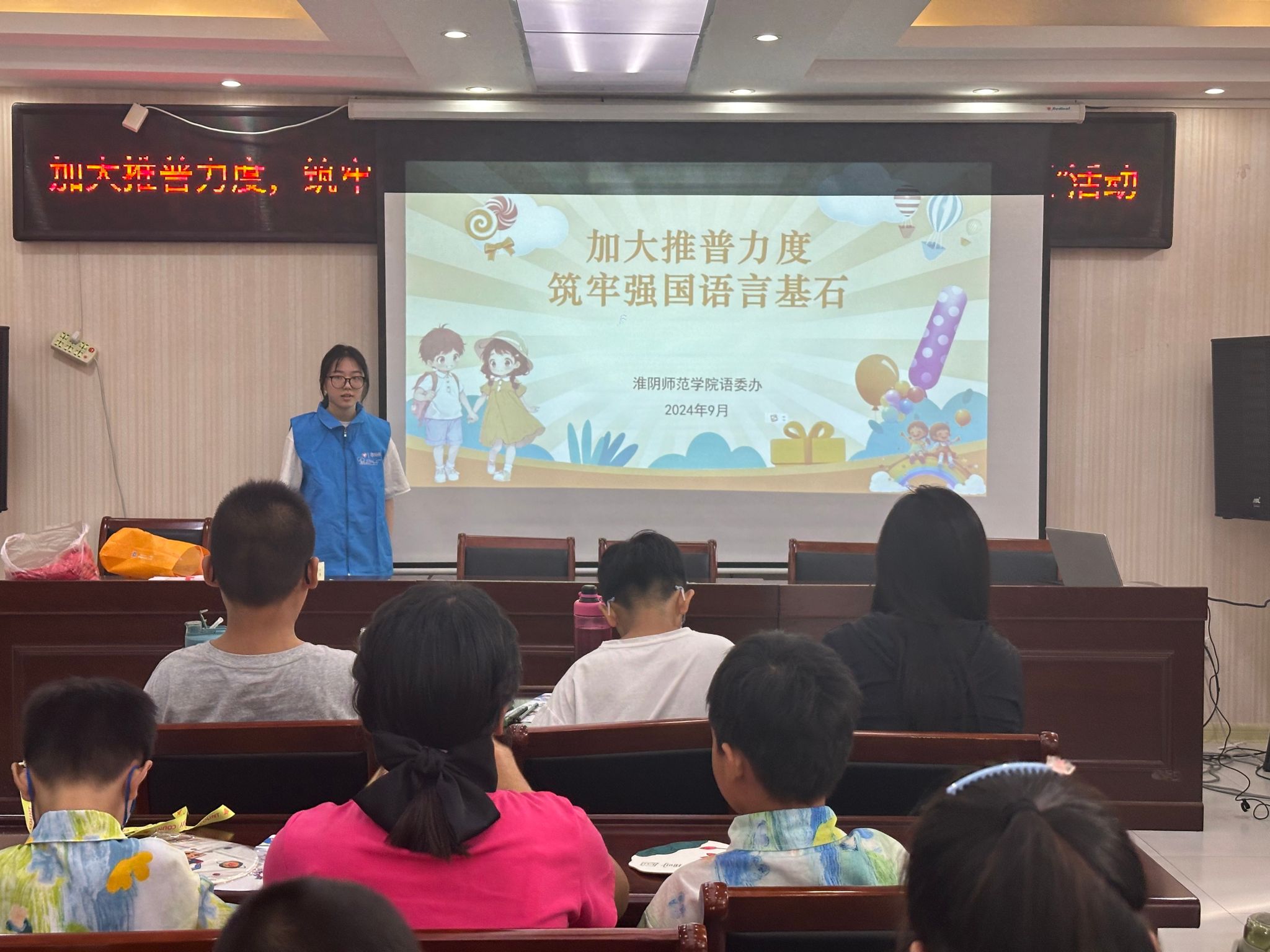 主动深入乡镇街道,贡献淮师青年力量。校语委组织推普团队赴省内外开展了“诵读传经典,推普向未来”推普助力乡村振兴暑期社会实践活动。志愿者们前往学校乡镇社区,走进金湖县前锋镇白马湖中心小学、淮安区范集镇中学、淮阴区王家营街道西坝社区,带领孩子们分别开展了古诗词吟唱教学、规范汉字与普通话培训、周恩来童年故事阅读分享、入户考察调研和政策宣讲等形式多样的活动,助力乡村学校营造传承经典氛围,增强当地民众对普通话的认知和理解。