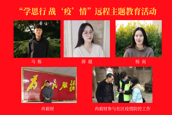 下好先手棋、打好主动仗,学生干部主动担当作为。组织广大青年学生认真习近平总书记给北京大学援鄂医疗队全体“90后”党员回信,1703班马栋、1702班薛越朗读人民日报评论员文章,在这场严峻斗争中,“90后”青年用实际行动证明了自己的责任、担当和价值,以拼搏奋斗展示了青年一代蓬勃向上的群像。1605班冉毅财把初心“写”在战“疫”一线,积极参与家乡社区疫情防控。“站着站着,你就睡着了;看着看着,我就哭了。”1901班“00后”杨南对“网红”有了新的理解。冲锋在抗疫一线的英雄们,他们成为青年学生赞美的新偶像。