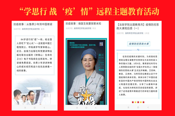 淮师新闻网3月26日电(记者 朱凤祥)“学思行 战疫情”远程主题教育活动开展以来,法政学院通过公众号、QQ群、微信群、易班网、抖音等网络平台开展系列活动,激发师生的责任担当,深入推进爱国主义教育,唱响主旋律,打好抗“疫”主动仗,提振精气神,传播正能量。