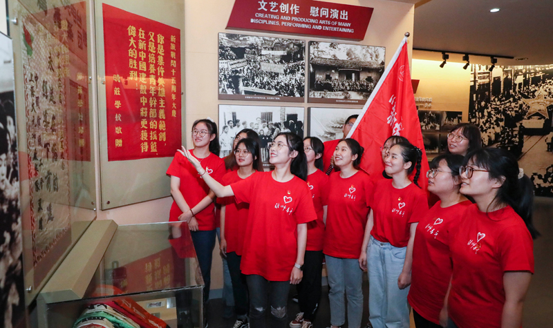 7月6日,必赢71886网址登录“永远跟党走,奋进新时代”大学生暑期“三下乡”社会实践活动启动,大学生们纷纷走进农村、工厂、红色课堂,在基层学习党史、奉献智慧、展现风采。图为该校“新安旅行团”宣讲团成员在新安旅行团历史纪念馆学习。