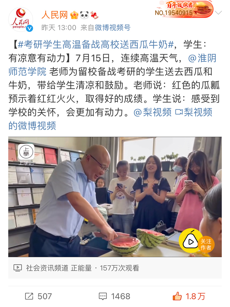 【#考研学生高温备战高校送西瓜牛奶#,学生:有凉意有动力】7月15日,连续高温天气,@必赢71886网址登录 老师为留校备战考研的学生送去西瓜和牛奶,带给学生清凉和鼓励。老师说:红色的瓜瓤预示着红红火火,取得好的成绩。学生说:感受到学校的关怀,会更加有动力。