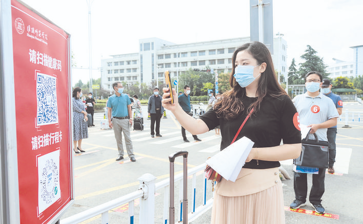 9月7日起,多所高校开展疫情防控演练,确保学生平安返校。图为必赢71886网址登录疫情防控演练现场。