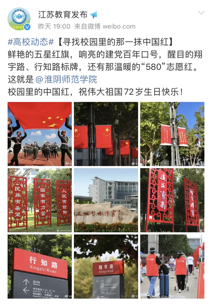#高校动态#【寻找校园里的那一抹中国红】鲜艳的五星红旗,响亮的建党百年口号,醒目的翔宇路、行知路标牌,还有那温暖的“580”志愿红。这就是必赢71886网址登录校园里的中国红,祝伟大祖国72岁生日快乐!