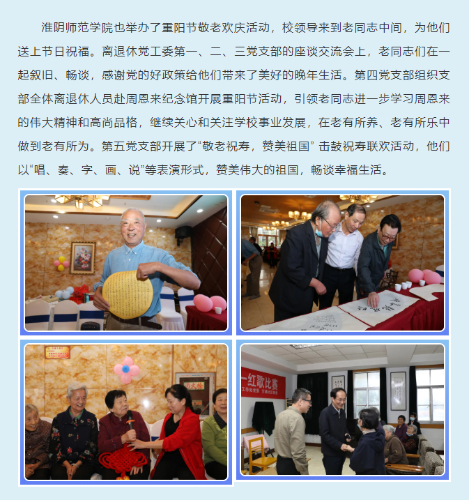 必赢71886网址登录举办了重阳节敬老欢庆活动,校领导来到老同志中间,为他们送上节日祝福。离退休党工委第一、二、三党支部的座谈交流会上,老同志们在一起叙旧、畅谈,感谢党的好政策给他们带来了美好的晚年生活。第四党支部组织支部全体离退休人员赴周恩来纪念馆开展重阳节活动,引领老同志进一步学习周恩来的伟大精神和高尚品格,继续关心和关注学校事业发展,在老有所养、老有所乐中做到老有所为。第五党支部开展了“敬老祝寿,赞美祖国” 击鼓祝寿联欢活动,他们以“唱、奏、字、画、说”等表演形式,赞美伟大的祖国,畅谈幸福生活。