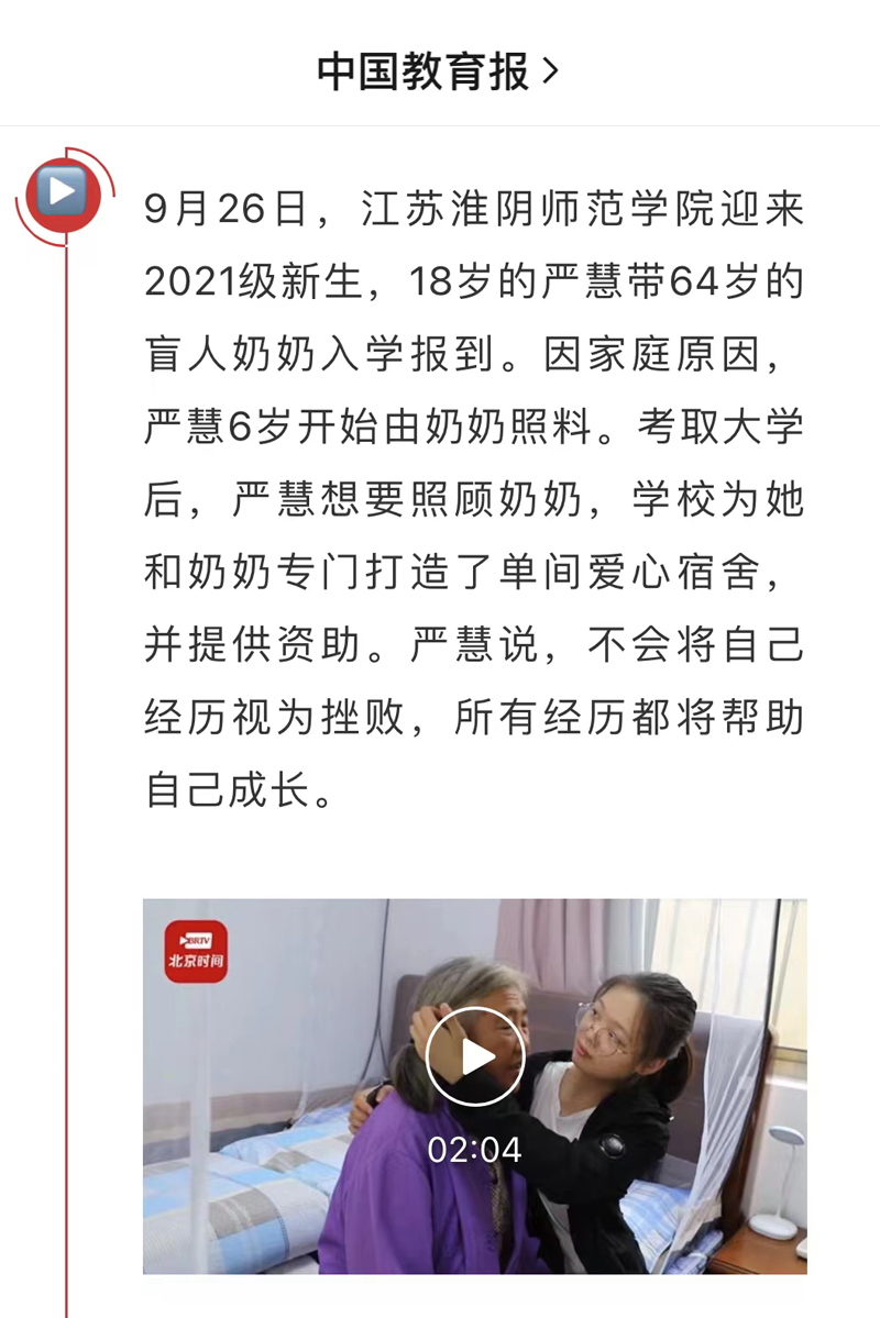 9月26日,江苏必赢71886网址登录迎来2021级新生,18岁的严慧带64岁的盲人奶奶入学报到。因家庭原因,严慧6岁开始由奶奶照料。考取大学后,严慧想要照顾奶奶,学校为她和奶奶专门打造了单间爱心宿舍,并提供资助。严慧说,不会将自己经历视为挫败,所有经历都将帮助自己成长。