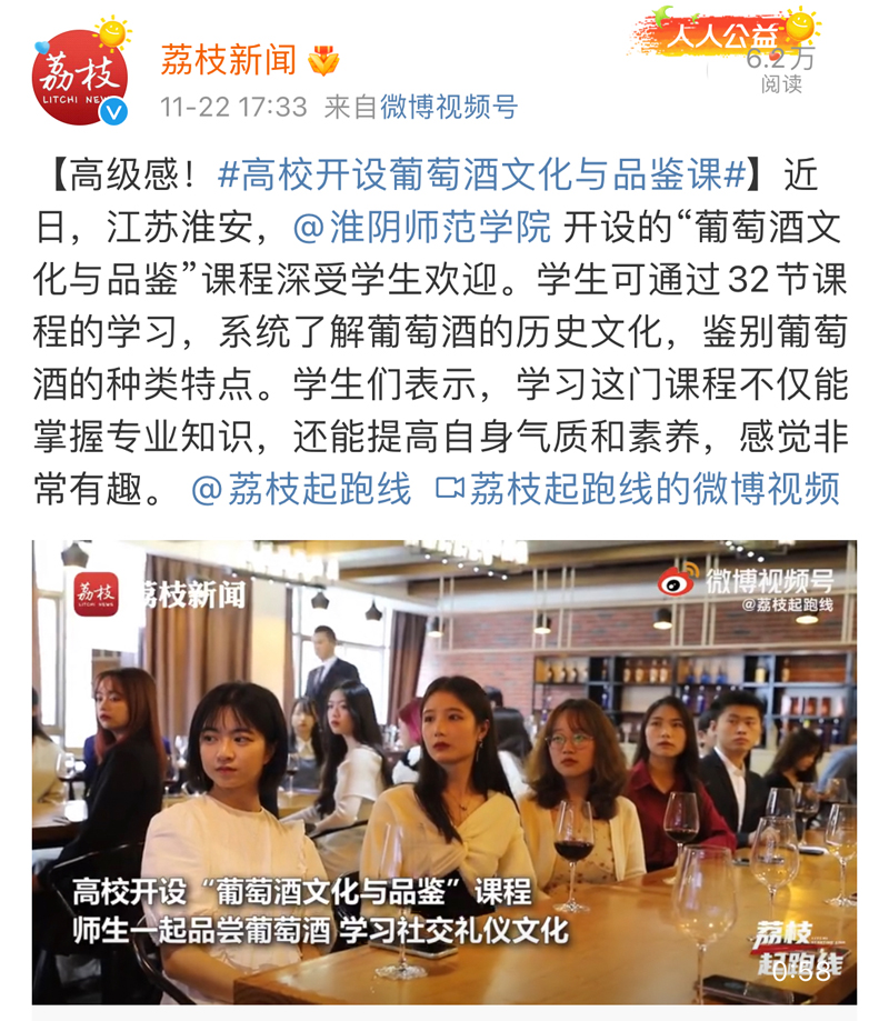 【高级感!#高校开设葡萄酒文化与品鉴课#】近日,江苏淮安,@必赢71886网址登录 开设的“葡萄酒文化与品鉴”课程深受学生欢迎。学生可通过32节课程的学习,系统了解葡萄酒的历史文化,鉴别葡萄酒的种类特点。学生们表示,学习这门课程不仅能掌握专业知识,还能提高自身气质和素养,感觉非常有趣。
