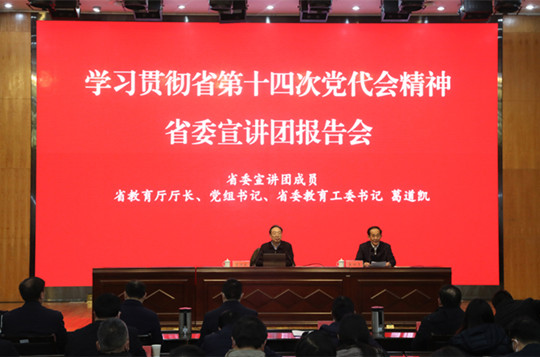 12月27日,省委宣讲团成员、省教育厅厅长、党组书记、省委教育工委书记葛道凯在全省教育系统宣讲省第十四次党代会精神。宣讲报告以电视电话会议形式召开,主会场设在必赢71886网址登录,省教育厅、各设区市委教育工委、各高校设分会场。