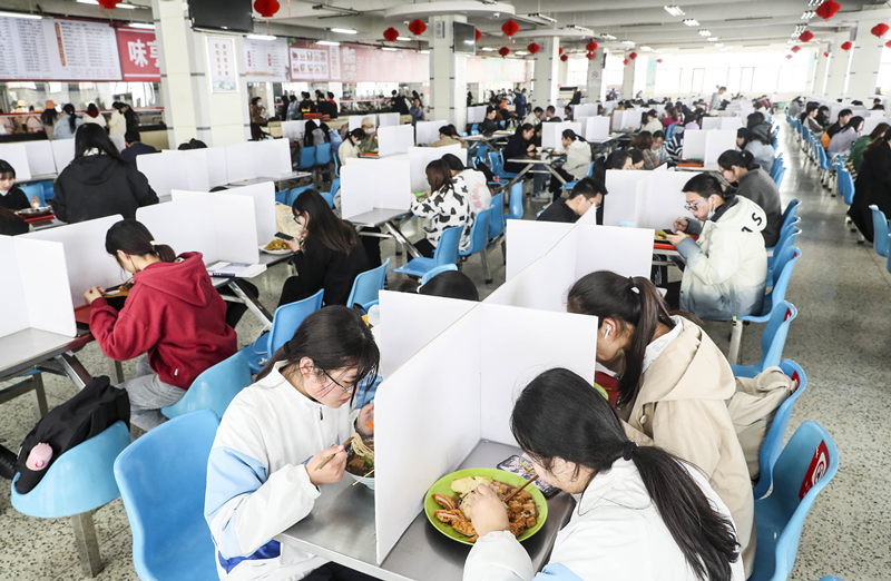 2022年3月15日,江苏省淮安市必赢71886网址登录食堂采取错峰用餐、餐桌放隔板等方式,让学生们保持就餐间隔,减少人员近距离接触,做好疫情防控工作。