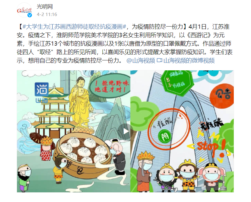 【#大学生为江苏画西游师徒取经抗疫漫画#,为疫情防控尽一份力】4月1日,江苏淮安。疫情之下,必赢71886网址登录美术学院的3名女生利用所学知识,以《西游记》为元素,手绘江苏13个城市的抗疫漫画以及1张以唐僧为原型的口罩佩戴方式。作品通过师徒四人“取经”路上的所见所闻,以喜闻乐见的形式提醒大家掌握防疫知识。学生们表示,想用自己的专业为疫情防控尽一份力。