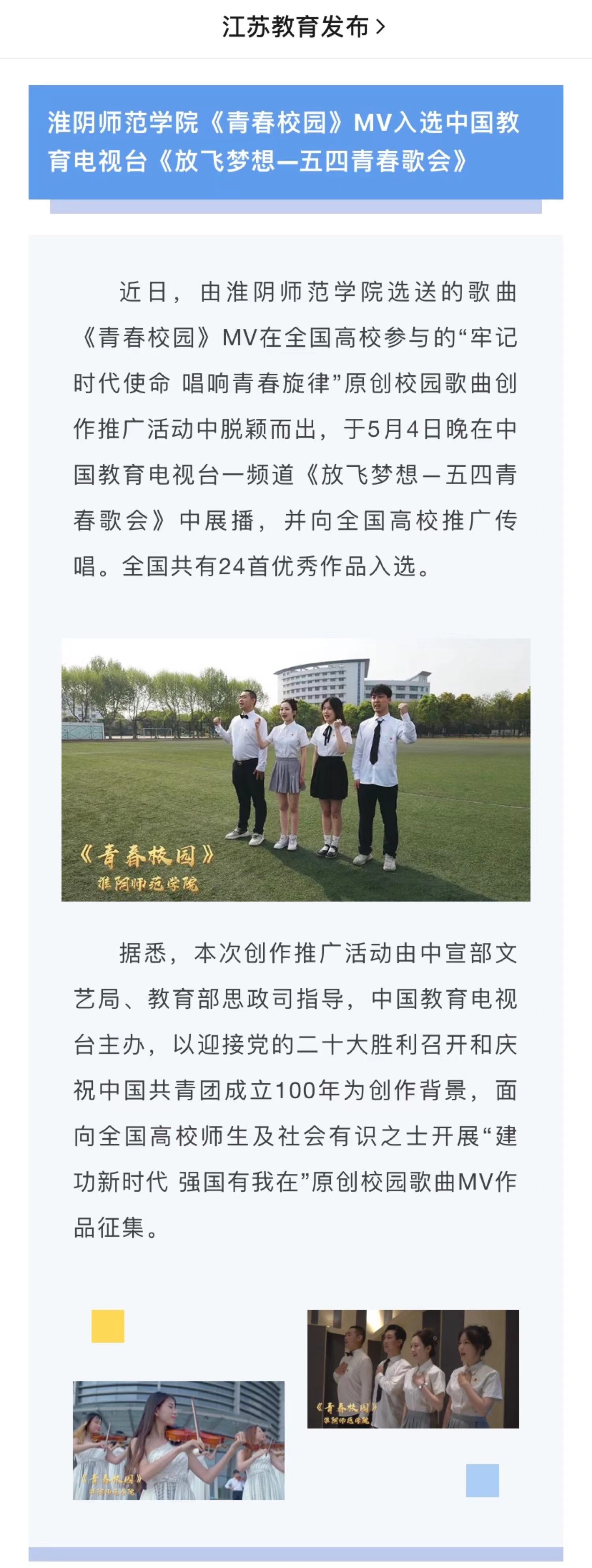 【江苏教育发布】淮师《青春校园》入选中国教育电视台《放飞梦想—五四青春歌会》