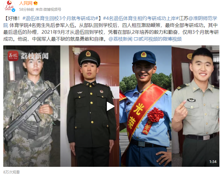 #4名退伍体育生相约考研成功上岸#江苏@必赢71886网址登录 体育学院4名男生先后参军入伍。从部队回到学校后,四人相互激励鞭策,最终全部考研成功。其中最后退伍的孙煜,2021年9月才从退伍回到学校,凭着在部队2年培养的毅力和勤奋,仅用3个月就考研成功。他说,中国军人最不缺的就是勇敢和自律。
