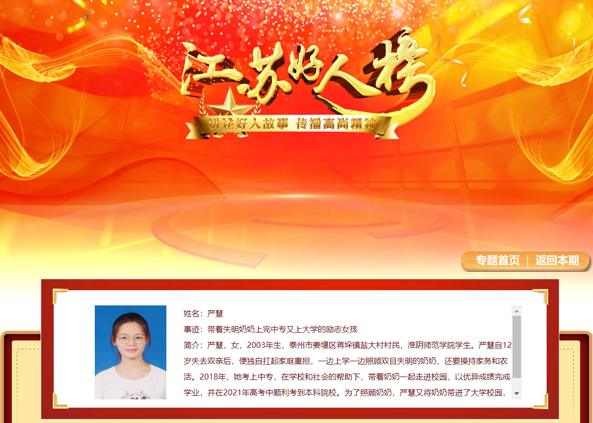 严慧,女,2003年出生,泰州市姜堰区蒋垛镇盐大村人。6岁,妈妈离家出走,12岁,爸爸患病去世,她不得不在懵懂的年纪接过家庭的重担,一边上学一边照顾双目失明的奶奶,家务、农活她样样拿手。由于放心不下奶奶,在学校和社会的帮助下,她带着奶奶一起走进校园,完成中专三年学业。今年高考,她成为全校唯一一名考上本科的学生,望着奶奶虚弱的身体,她决定继续带着奶奶读大学。现在,严慧最大的理想就是毕业之后做一名教师,回馈社会。