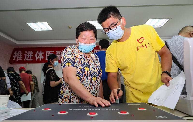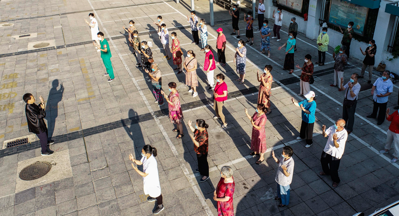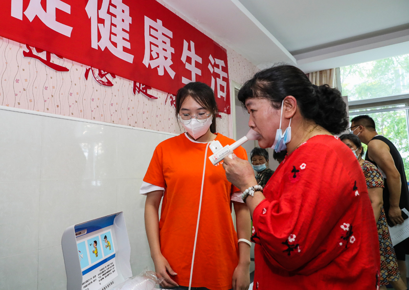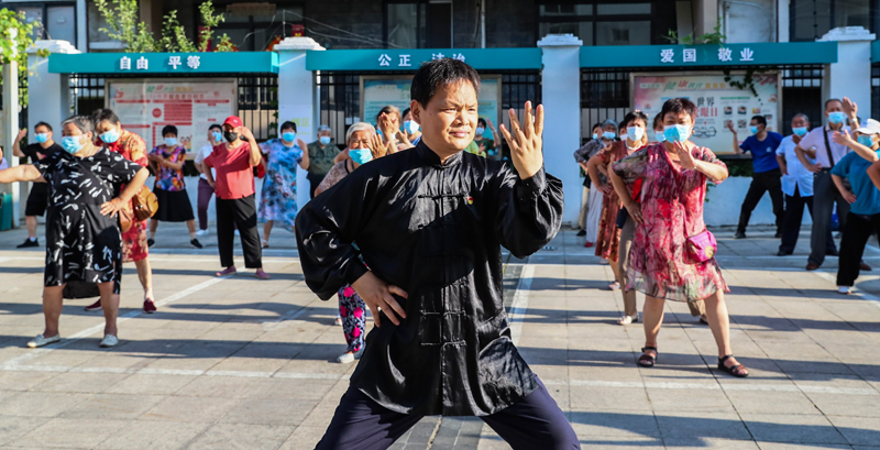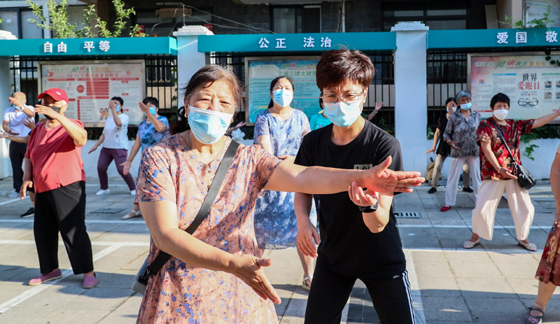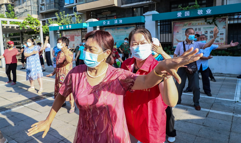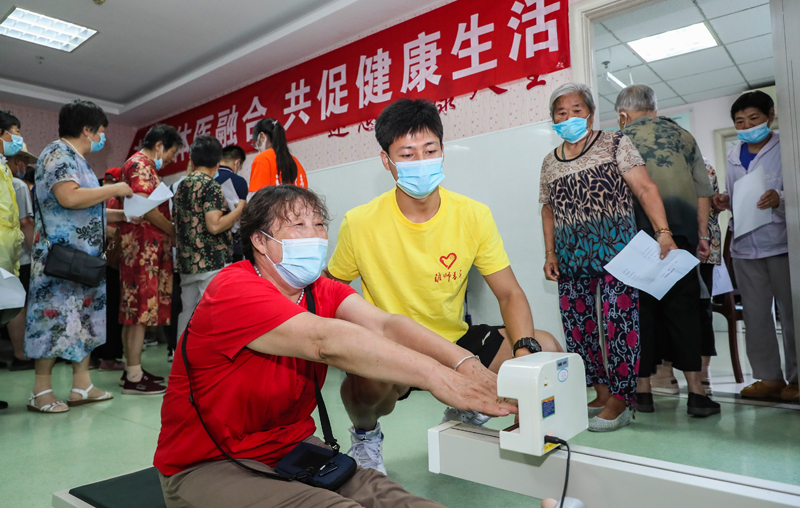 2022年7月1日,江苏淮安,必赢71886网址登录体育学院携手钵池山社区开展“体医融合促健康进社区”服务活动,师生为居民教授简单体育运动、测试体质、健康饮食、居家抗阻练习等,倡导居民科学健身,增强体质,促进健康。