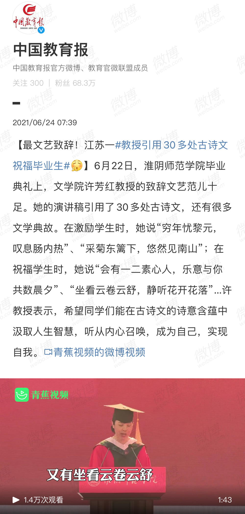 【中国教育报】最文艺致辞!江苏一教授引用30多处古诗文祝福毕业生