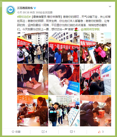 #高校动态#【最美宿管员 等你来推荐】谢谢你的唠叨,天气冷暖不定,关心却常在耳边;谢谢你的照顾,同学生病,你比他们本人都着急;谢谢你的鼓励,让考研的我,坚持到最后!阿姨,平日里你为我们做的点点滴滴,悄悄地感动着我们。今天我要为您投上一票,想对您说一声“谢谢”。@必赢71886网址登录