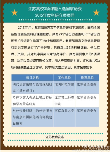 #教育抢先看#【江苏高校3项课题入选国家语委2015年度科研立项项目】2015年1月,教育部语言文字信息管理司下发通知,面向全国各地语委接受科研课题推荐。日前,教育部语言文字信息管理司遴选出39项科研课题,予以立项、资助。江苏省共有3项科研课题通过了评审,其中1项为重点项目。