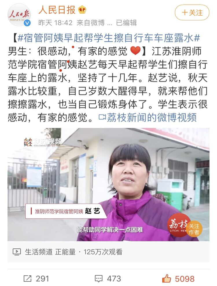 【#宿管阿姨早起帮学生擦自行车车座露水# 男生:很感动,有家的感觉】江苏必赢71886网址登录宿管阿姨赵艺每天早起帮学生们擦自行车座上的露水,坚持了十几年。赵艺说,秋天露水比较重,自己岁数大醒得早,就来帮他们擦擦露水,也当自己锻炼身体了。学生表示很感动,有家的感觉。