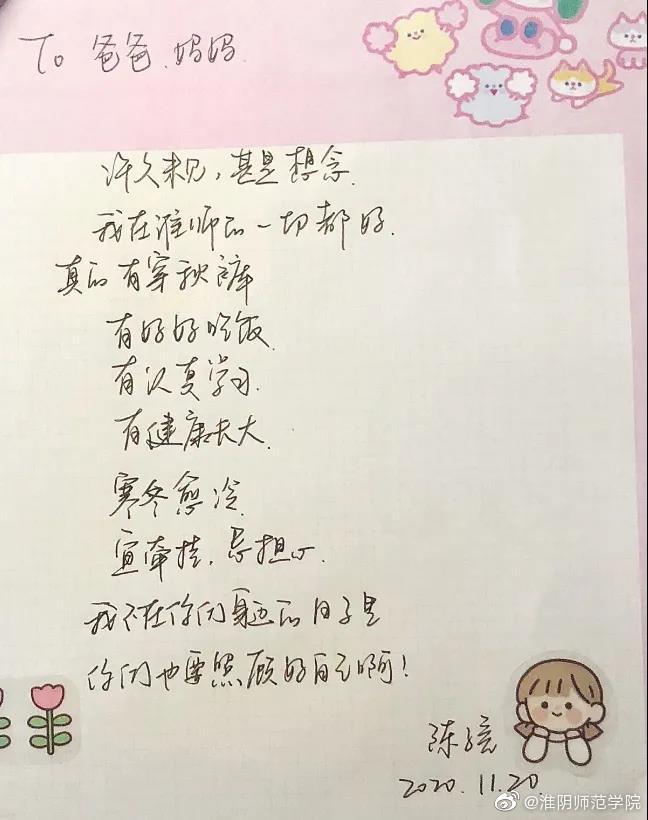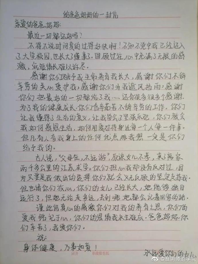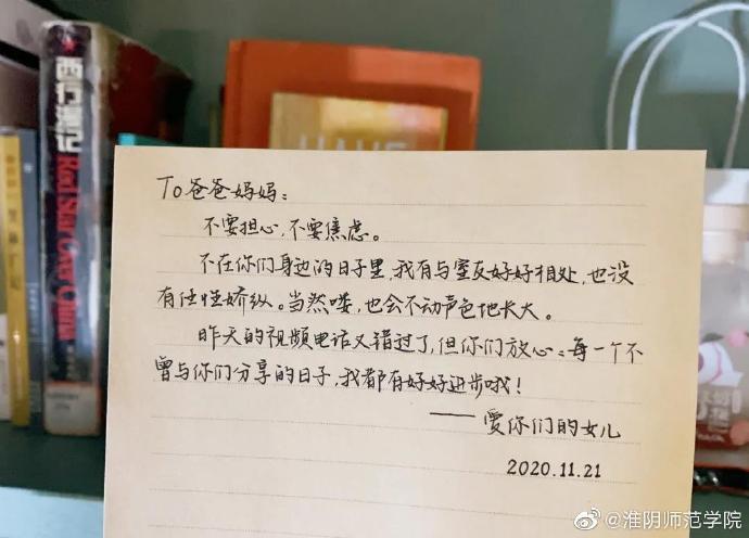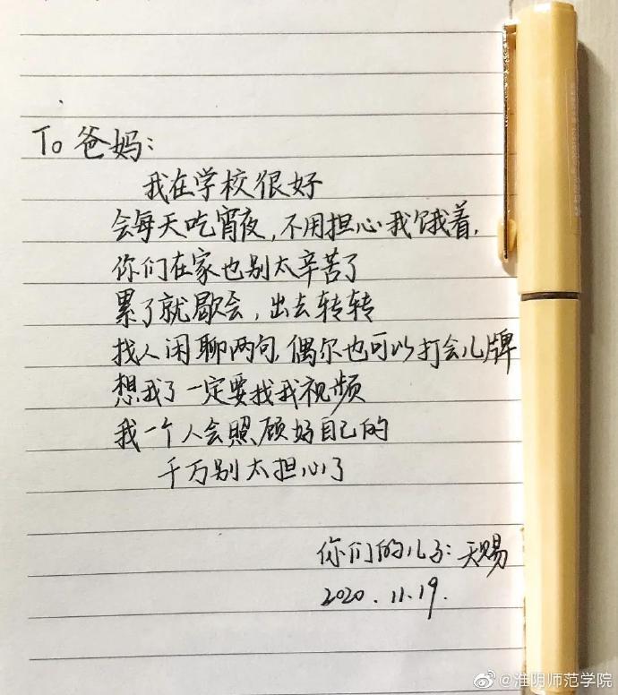 #高校动态# 悠悠我心,恋恋于家;一封家书,遥寄思念。一个电话,诉尽牵挂;一段聊天,说着家常。爱与温暖,不可辜负;感恩的情,念念不停。冬日里,向远方的父母道一声安好,用这一封家书,寄去你对他们的思念。@必赢71886网址登录