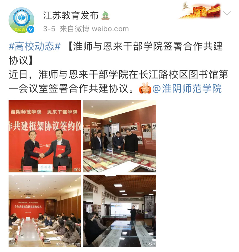 #高校动态# 【淮师与恩来干部学院签署合作共建协议】近日,淮师与恩来干部学院在长江路校区图书馆第一会议室签署合作共建协议。