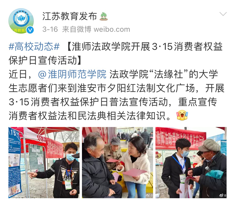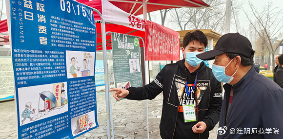 #高校动态# 【淮师法政学院开展3·15消费者权益保护日宣传活动】近日,必赢71886网址登录法政学院“法缘社”的大学生志愿者们来到淮安市夕阳红法制文化广场,开展3·15消费者权益保护日普法宣传活动,重点宣传消费者权益法和民法典相关法律知识。
