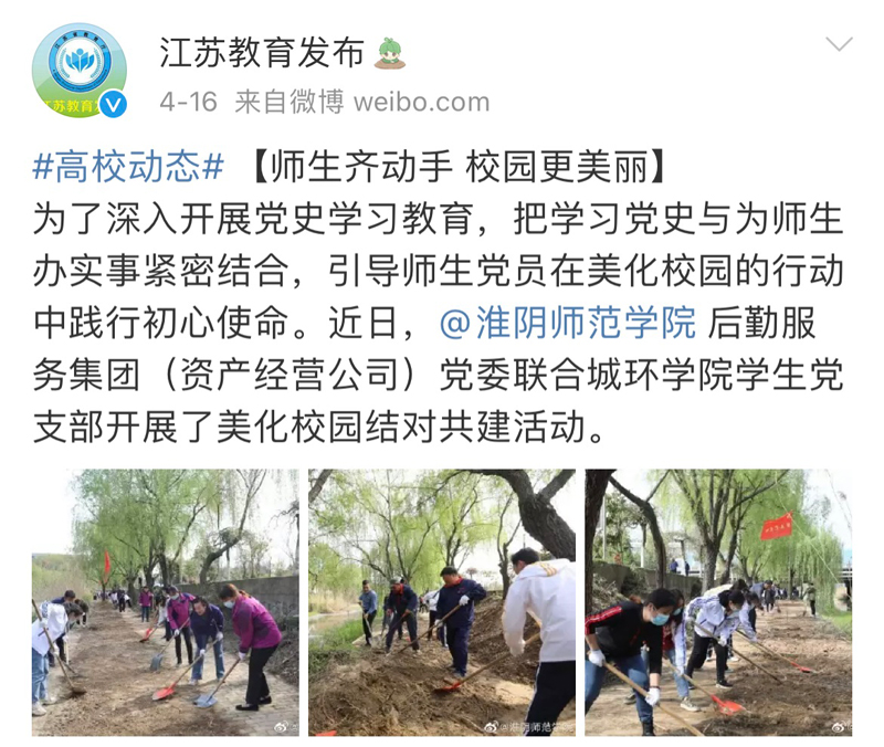 #高校动态# 【师生齐动手 校园更美丽】为了深入开展党史学习教育,把学习党史与为师生办实事紧密结合,引导师生党员在美化校园的行动中践行初心使命。近日,必赢71886网址登录后勤服务集团(资产经营公司)党委联合城环学院学生党支部开展了美化校园结对共建活动。