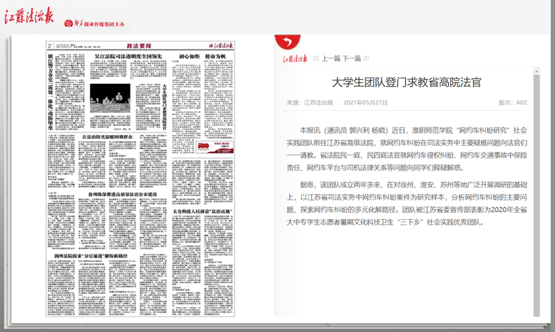 据悉,该团队成立两年多来,在对徐州、淮安、苏州等地广泛开展调研的基础上,以江苏省司法实务中网约车纠纷案件为研究样本,分析网约车纠纷的主要问题,探索网约车纠纷的多元化解路径。团队被江苏省委宣传部表彰为2020年全省大中专学生志愿者暑期文化科技卫生“三下乡”社会实践优秀团队。