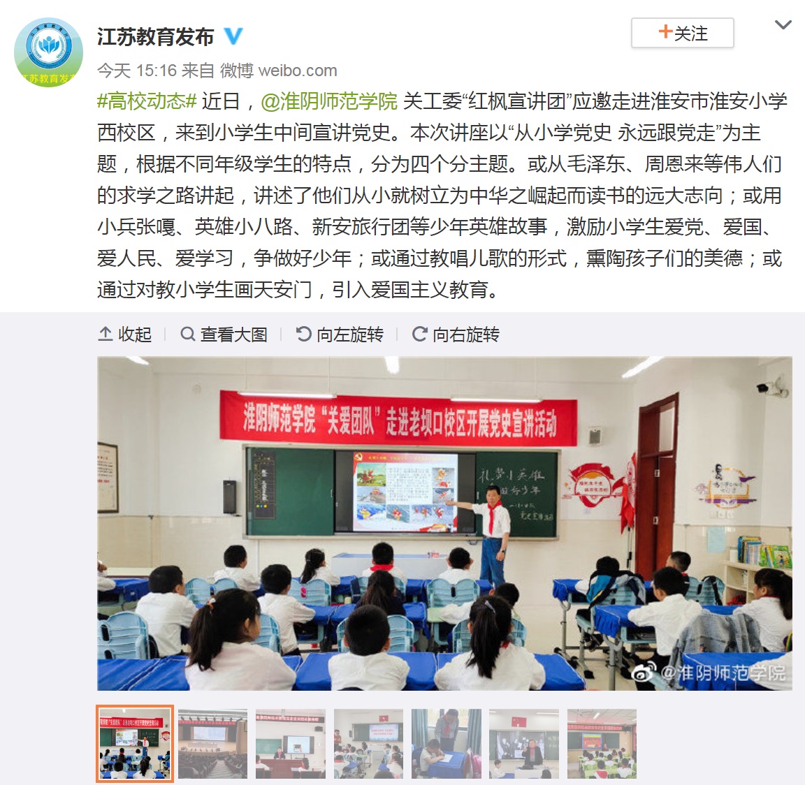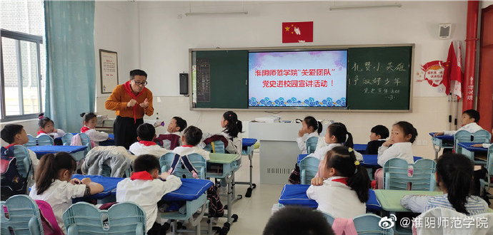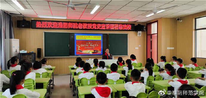 #高校动态# 近日,必赢71886网址登录关工委“红枫宣讲团”应邀走进淮安市淮安小学西校区,来到小学生中间宣讲党史。本次讲座以“从小学党史 永远跟党走”为主题,根据不同年级学生的特点,分为四个分主题。或从毛泽东、周恩来等伟人们的求学之路讲起,讲述了他们从小就树立为中华之崛起而读书的远大志向;或用小兵张嘎、英雄小八路、新安旅行团等少年英雄故事,激励小学生爱党、爱国、爱人民、爱学习,争做好少年;或通过教唱儿歌的形式,熏陶孩子们的美德;或通过对教小学生画天安门,引入爱国主义教育。