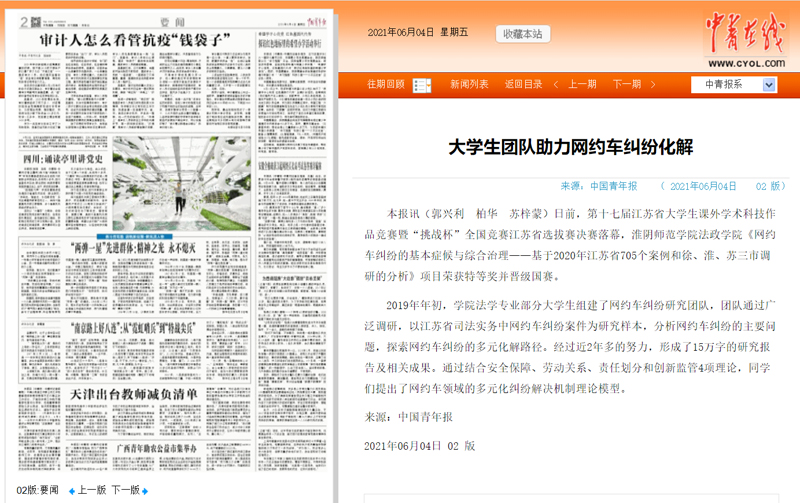 2019年年初,学院法学专业部分大学生组建了网约车纠纷研究团队,团队通过广泛调研,以江苏省司法实务中网约车纠纷案件为研究样本,分析网约车纠纷的主要问题,探索网约车纠纷的多元化解路径。经过近2年多的努力,形成了15万字的研究报告及相关成果。通过结合安全保障、劳动关系、责任划分和创新监管4项理论,同学们提出了网约车领域的多元化纠纷解决机制理论模型。